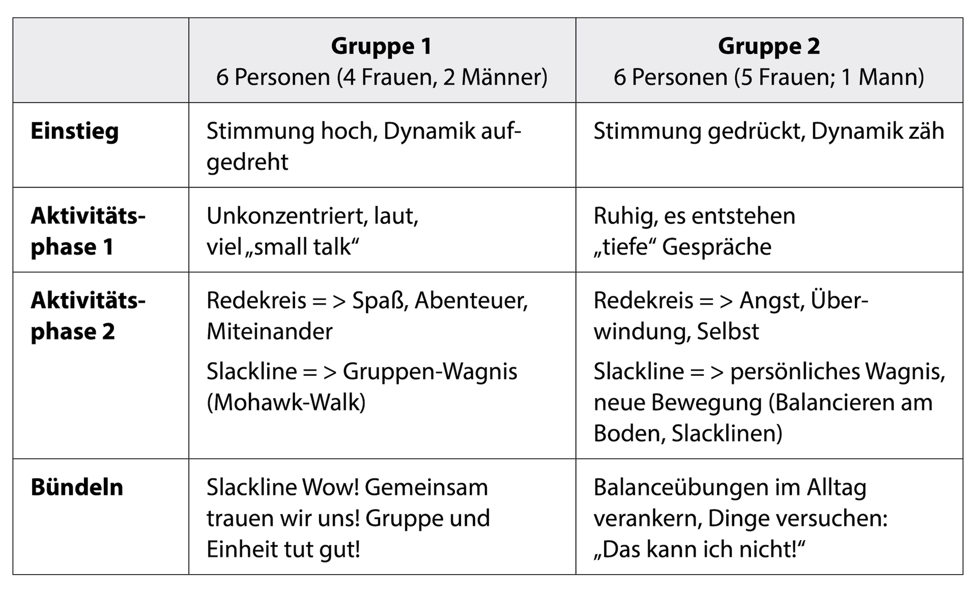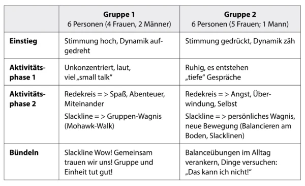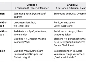 Tabelle 1 Gegenüberstellung der Trainerdokumentation zweier Beweg’ dich für die Seele-Einheiten Etwas Neues wagen von zwei unterschiedlichen Gruppen, durchgeführt vom selben Trainer.