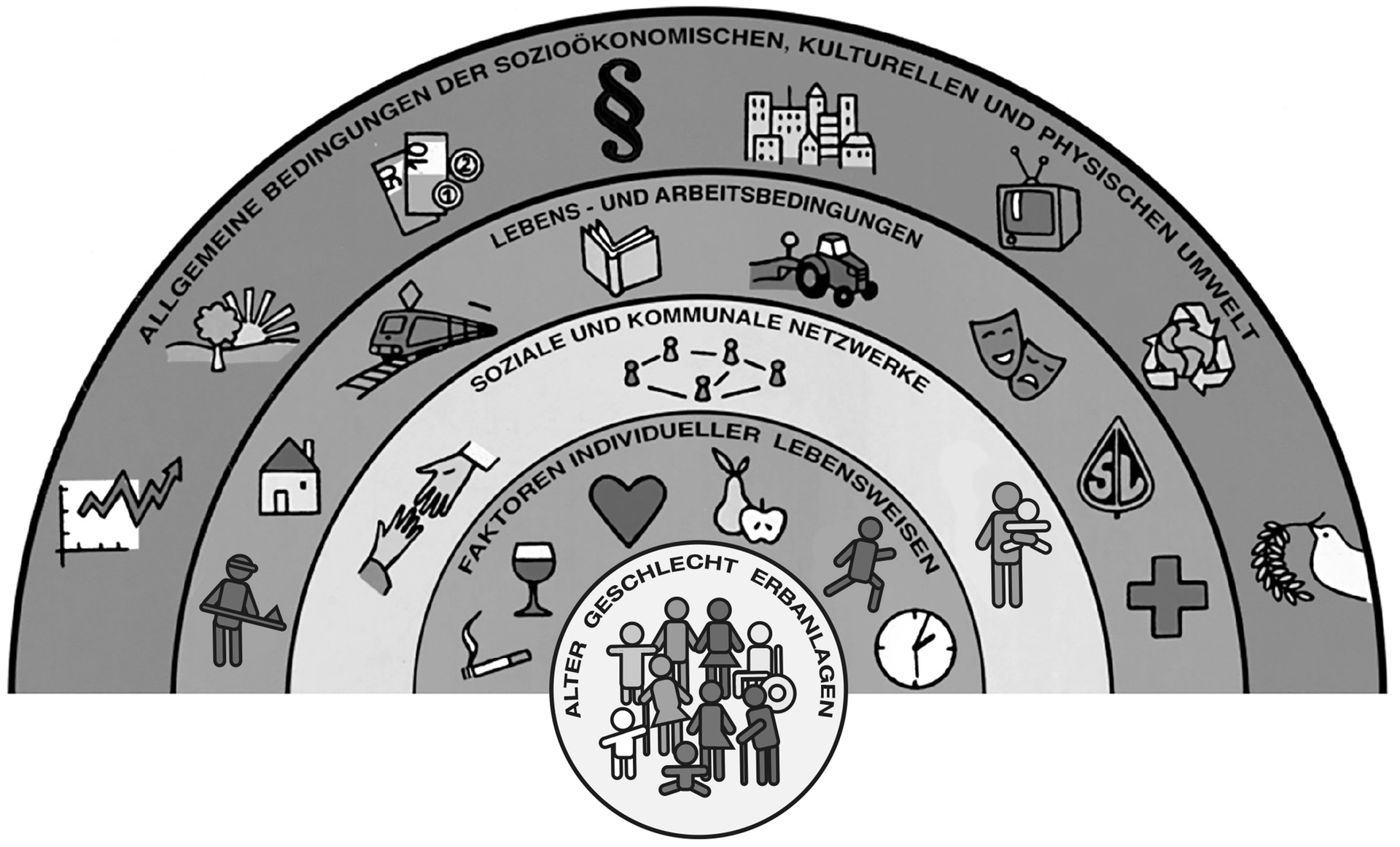 Abbildung 1 Gesundheitsdeterminanten, Fonds Gesundes Österreich (2023) nach G. Dahlgren & Whitehead (1991).