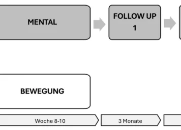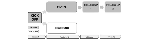 Das Programmdesign wurde ursprünglich von der ÖGK entwickelt (siehe Abbildung 3). Eine Gruppe von max. 12 Teilnehmer:innen durchläuft eine Intensivphase von acht bis zehn Wochen mit je einer Mental- und einer Bewegungseinheit pro Woche sowie zwei Follow-Up-Terminen im Abstand von jeweils drei Monaten. In den Mentaleinheiten werden mittels Selbstreflexion und Übungen Motivations- und Zielsetzungsprozesse gefördert und verschiedene Entspannungstechniken angeleitet. In den Bewegungseinheiten wird körperliche Aktivität durchgeführt.