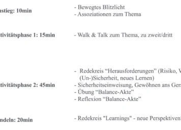Das in Tabelle 1 dargestellte Beispiel zeigt, wie ein offener, prozess- und handlungsorientierter Ansatz in der Bewegungseinheit die aktuell vorliegenden Gruppenthemen aufgreifen kann und zu völlig unterschiedlichem Lernen der Teilnehmer:innen führt. Während in Gruppe 1 das Thema Gruppe/soziale Unterstützung im Vordergrund steht, sind es in Gruppe 2 persönliche körperliche Themen (Gleichgewichtsfähigkeit, eigene Bewegungsfähigkeiten).