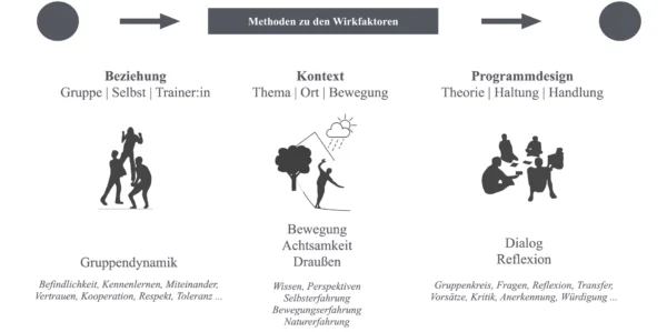 So werden in jeder Bewegungseinheit konkrete Methoden zu allen drei Wirkfaktoren angeboten: Auf der Ebene Beziehung sind dies Methoden zur Förderung von sozialem Lernen; Gruppendynamik und Zusammenhalt wird durch Interaktionen in der Gruppe bewusst initiiert. Auf der Ebene Kontext ritualisieren die Trainer:innen von Freiluftleben immer wieder ein Thema, einen Ort, das Draußen unterwegs sein (Naturraum) und die körperliche Aktivität (Bewegung). Dadurch erfährt das Programm eine abwechslungsreiche und besondere Note (Amesberger G. & Würth, 2010; Buckley et al., 2018; Gebhart, 2010). Beziehung und Kontext stehen in jeder Bewegungseinheit in einem ständigen Austausch.