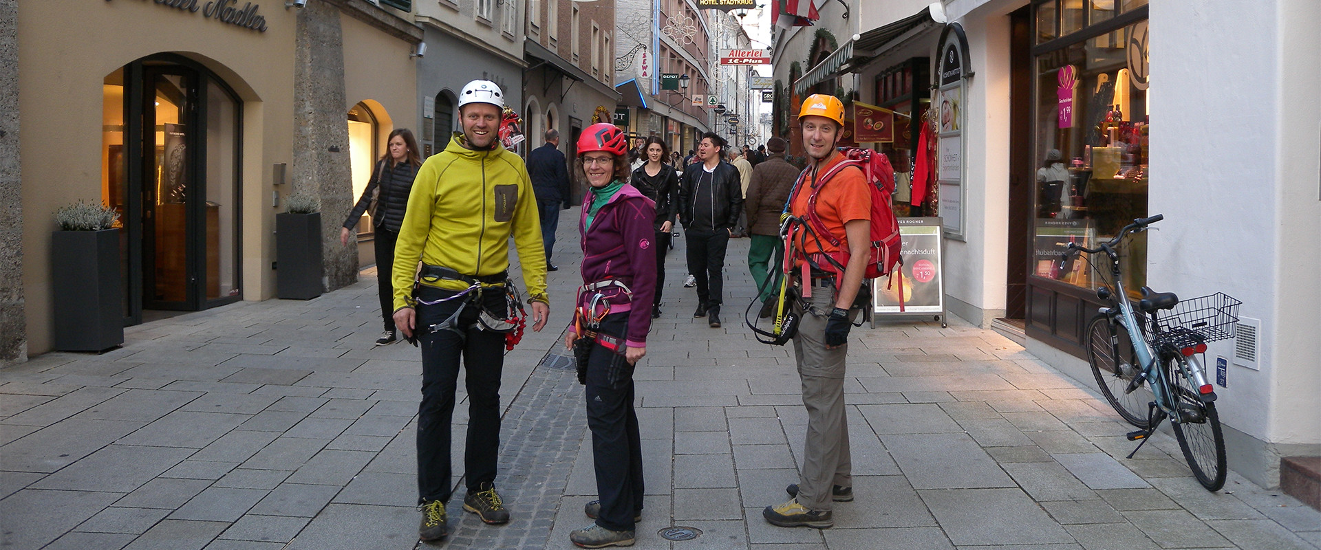 Treffpunkt ist am späten Vormittag das Ende der Linzergasse vor der Akzente (430 m) in Salzburg. Nach einer Einführung und einem kleinen Übungsklettersteig starten wir in einen der drei Klettersteigvarianten an der City Wall. Nach ca. 30 bis 40 min erreichen wir den Ausstieg, genießen den Blick über die Stadt Salzburg und schlendern gemütlich durch die Linzergasse zurück zum Ausgangspunkt.
